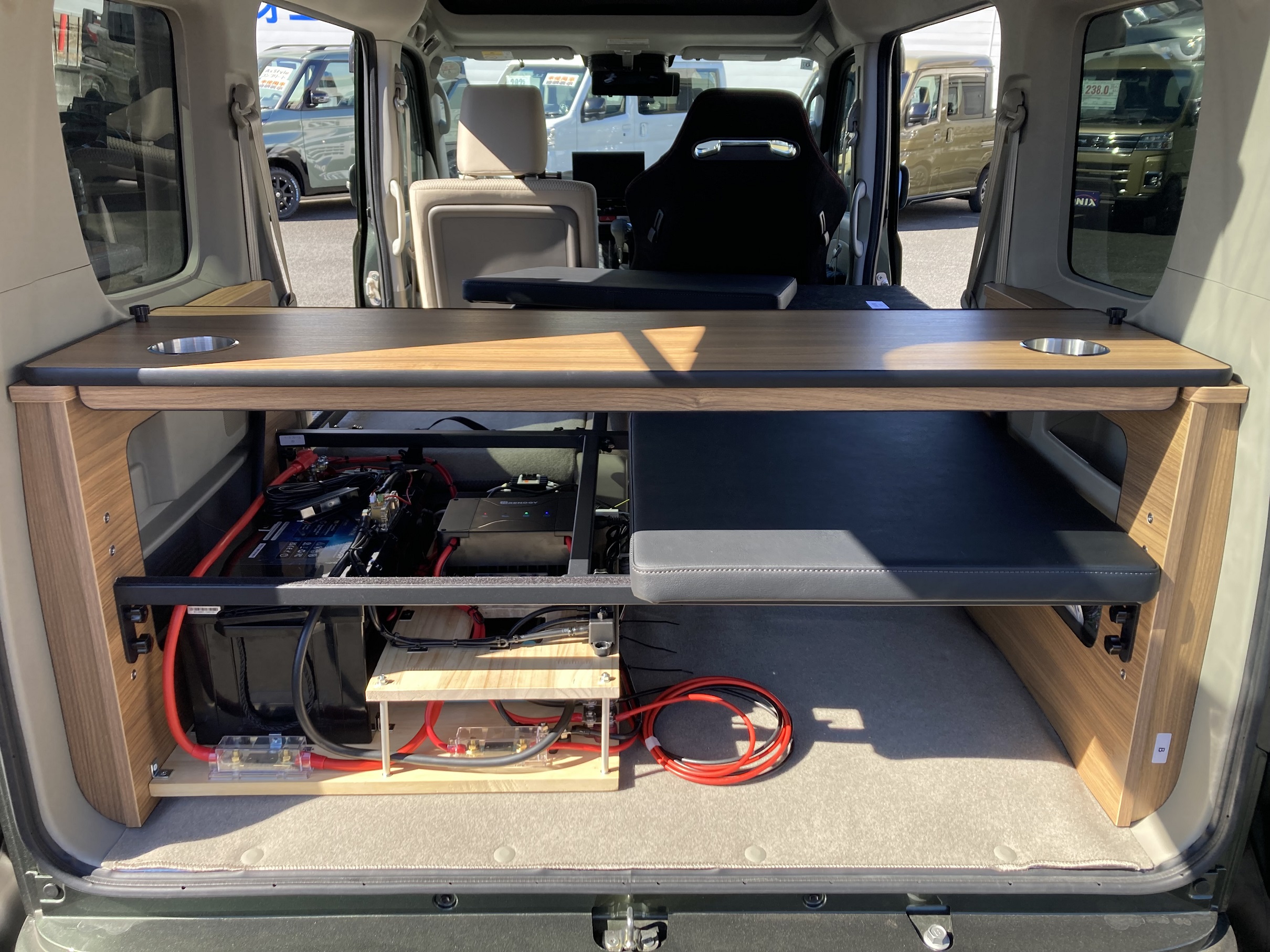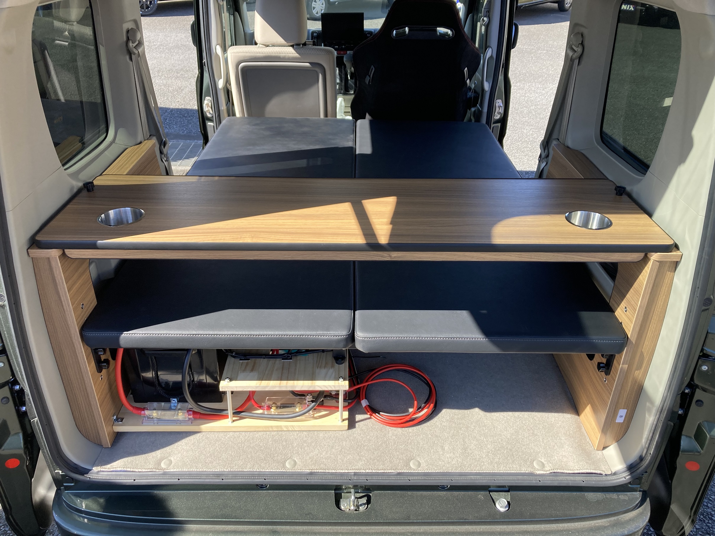 車中泊用ベッドにサブバッテリーシステムも完成したとのこと。